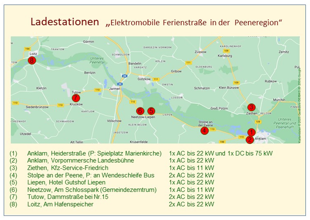 Der Verein VORPOMMERSCHE DORFSTRASSE e.V. schafft Voraussetzungen für den Einzug der E-Mobilität in die strukturschwache Peeneregion. Dabei erhält er ideelle Unterstützung durch die Inselwerke e.G. ((hier) und die Stiftung Akademie für Nachhaltige Entwicklung MV (hier) .